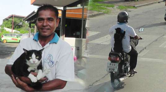 jarak 70km pulang pergi, maksudny krn kasian ditinggalkan dirumah krnny membawa kucing nya ketempat kerja, sayang nya sangat membahayakan pengendara dan kucingnya sendiri.