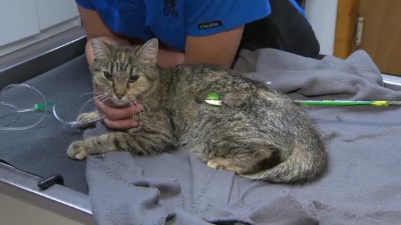Seekor kucing kampung dibidik panah, ketika seorang ibu membuka pintu, kucing ini tepat Jatuh berbaring di depan pintu,