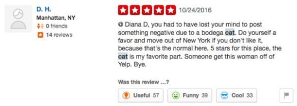 It seems all of NYC has turned against Diana D. since she foolishly decided to hate on bodega cats on Yelp- she has deleted her Yelp account and is now hoping the city’s bodega cats don’t decide to get revenge.