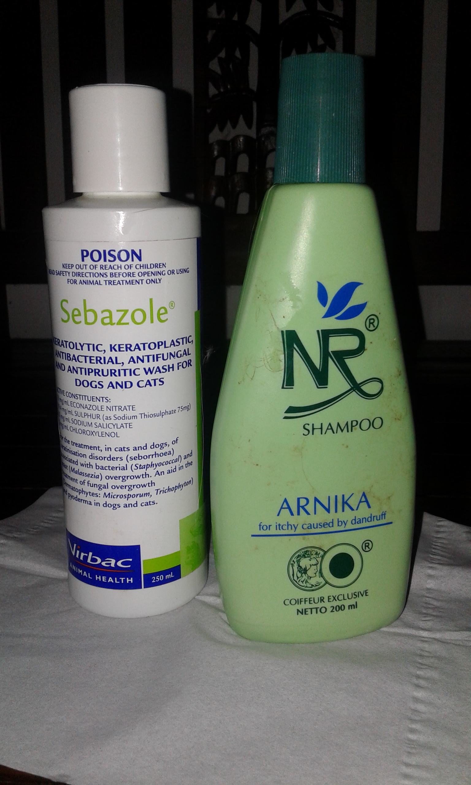 Untu shampo ,Ada trik lain juga tp sy sarankan sebazole -hrganya mmng mahal, nah foto dibawah ada shampo manusia, hy sy tdk sarankan walau manjur , sy pernah coba di taruh ke bagian jamur, langsung rontok jamurnya, sy tdk sarankan krn ada kandungan yg tdk baik, silahkan dibrowsing sendiri 🙂 , dua2nya warna nya hampir sama: hijau , satu agak kental satunya encer. Utk bau :harum yg lbh mahal 🙂
