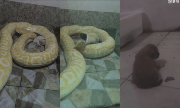 Rekaman menunjukkan anak anjing cokelat kecil, tidak lebih dari satu atau dua minggu yang lalu, di lantai kandang, di samping kotak berisi ular piton Burma.