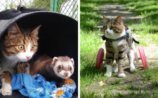 Kucing ini berusia satu thn ketika kehilangan dua kakinya saat tersengat listrik di kawat yg dialiri listrik,
